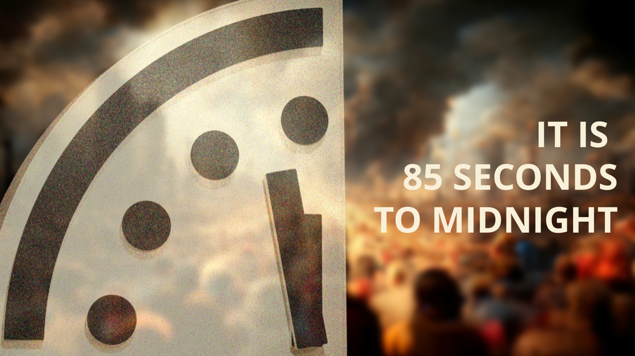 De Doomsday Clock is een symbolische klok die sinds 1947 wordt bijgehouden door het Bulletin of the Atomic Scientists aan de universiteit van Chicago. Deze klok geeft aan hoe dicht de mensheid zich naar schatting bij het einde van de wereld bevindt, gesymboliseerd door twaalf uur middernacht. Dit einde kan het gevolg zijn van militaire activiteiten, maar ook van wereldwijde rampen. Op basis van actuele ontwikkelingen en wetenschappelijke waarnemingen wordt eenmaal per jaar bepaald hoe laat het is op deze Doomsday Clock. Bij de eerste keer in 1947 werd de klok op zeven minuten voor middernacht gezet. Tijdens de Koude Oorlog kwam de klok op twee minuten voor middernacht te staan, maar na de val van de Sovjet-Unie werd in 1991 de tijd bijgesteld naar zeventien minuten. De afgelopen jaren is de situatie echter dramatisch verslechterd. We hebben het inmiddels niet meer over minuten, maar over seconden. De Doomsday Clock van 2026 kwam uit op vijfentachtig seconden voor middernacht.